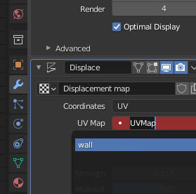 Wir laden die im vorherigen Tutorial gespeicherte Datei "blender_wall_pbr_material_displace_modificator.blend" (diejenige, in der wir den Modifikator "Displace" verwendet hatten, um die geprägten Ziegel zu erstellen) und benennen rechts in "Object Data Properties > UV Maps" "UVMap" um mit "wall"