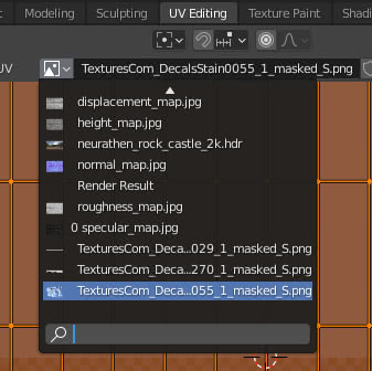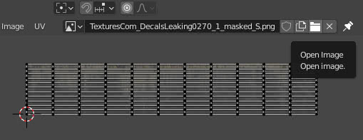 Laden Sie die Textur TexturesCom_DecalsLeaking0270_1_masked_S.png von der Website textures.com herunter (derzeit befindet sie sich unter https://www.textures.com/download/DecalsLeaking0270/85922) und laden Sie sie mit der Schaltfläche "Open Image" in die "UV Editor" auf der linken Seite