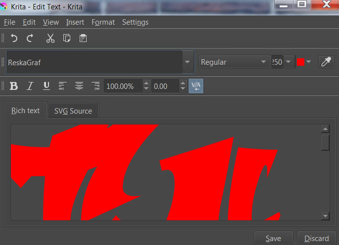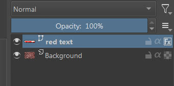 Wenn wir im "Docker" (Andockbare Dialoge) "Layers" (Ebenen) nach rechts schauen, stellen wir fest, dass eine Ebene vom Typ "Vector Layer" Vektorebene erstellt wurde (der Text wird als Vektorelement betrachtet), die wir umbenennen "red text" "Roter Text"