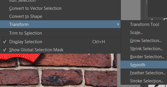 Wir machen die Auswahl weicher, damit die Farbe (mit der der innere Teil des Buchstabens gefüllt wird) anschließend verblasst: Klicken Sie mit der rechten Maustaste auf den ausgewählten Bereich und wählen Sie dann im Popup-Menü "Transform > Smooth" (Transformieren > Glätten)