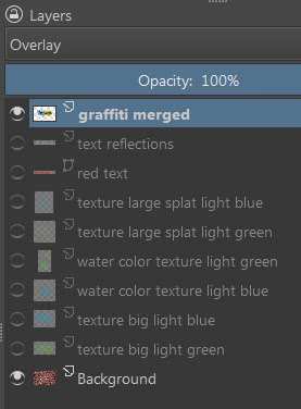 Wir nennen diese neue Ebene, die die zusammengeführten enthält, "graffiti merged" und blenden die ursprünglichen Ebenen aus. Dann wählen wir "Overlay" als Mischmodus für die neue Ebene