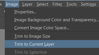 Wir beschneiden das Bild, sodass es mehr oder weniger nur die gemalten Bereiche gibt, mit "Image > Trim to Current Layer" (Bild > Auf aktuelle Ebene zuschneiden)