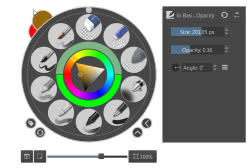 Zeigt die Palette an, in der Sie schnell Farben, Pinsel, deren Größe und Deckkraft und vieles mehr auswählen können