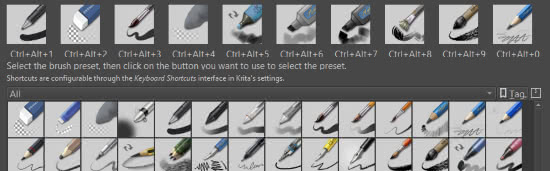 Sehen wir uns Shortcuts/Hotkeys an, beginnend mit Pinseln, dem am häufigsten verwendeten Werkzeug in Krita