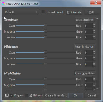 Mit diesem Filter können Sie direkt und separat auf die Farben von Schatten, Halbtönen und Lichtern einwirken, indem Sie die Schieberegler entsprechend den RGB- und CMY-Farben verschieben