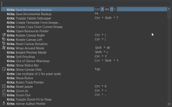Krita bietet ein Tool zum Suchen nach jeder Funktion und eventuell den zugehörigen Verknüpfungen. Durch Drücken der Tasten „Strg+Eingabe“ erscheint ein Fenster, in das wir eingeben können, wonach wir suchen