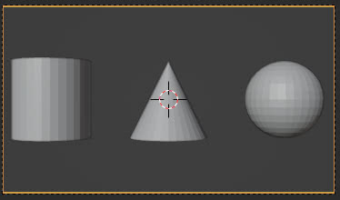 Let's start Blender, delete the default cube and create a cylinder, a cone and a sphere instead (we use these 3 solids because the blurring is more evident in them). In front view (obtained by pressing the "1" key in the numeric keypad) let's see