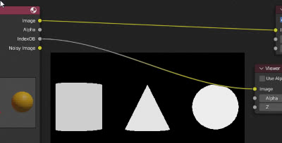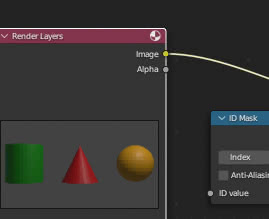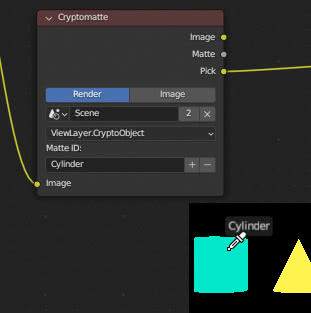 We connect the "Image" input port of the "Cryptomatte" node with the "Image" output of "Render Layers" and the "Pick" output of "Cryptomatte" with the "Viewer" node, possibly start the rendering and the three objects will appear in evidence. So let's press the "+" key to the right of the "Matte ID" parameter and select the cylinder with the dropper (and the writing "Cylinder" will appear in "Matte ID") in the preview.
