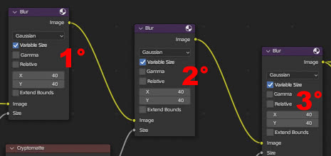 and we act only on the "x" and "y" parameters of the 3 "Blur" nodes present, which we will call first, second and third.