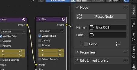where "Blur.001" is the name of the second "Blur" node; in fact if we select it and look at the panel on the right we find