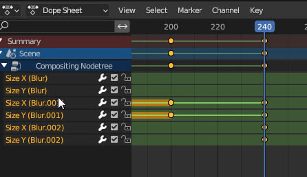 Again corresponding to frame 240, we also create keyframes in the third node "Blur", which is associated with the sphere, for the values x:40 and y:40 and we note in fact that new channels have appeared "Size X (Bur.002)" and "Size Y (Blur.002)" corresponding to the x and y of the third node (which is called "Blur.002")