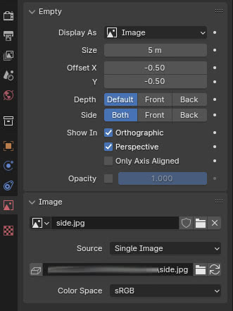 Side: Indicates on which side the image is visible. "Both" indicates that it is visible on both faces. "Front" means that the image is only visible on the front side (the one facing up if the image is laid out), this is especially useful when we want to create a reference image system, where the front image of a car should not be visible in the back view, or when we have placed a series of reference images, but we do not want them to be visible yet when we are modeling and we are rotating the view in the "3D View". "Back" means that the image is only visible on the back side (being able to switch from "Front" to "Back" can be useful when we do not want to rotate or move the "Empty" object)