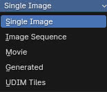 in whose "Image" panel, we can notice that the "Source" option suggests the possibility of loading, as a reference, in addition to single images, also sequences of images, movies, images generated internally by Blender (those needed for mapping), or UDIM files