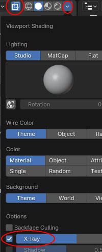 in this case we can also use a completely opaque reference image ("Opacity:1") however, since the object now completely covers the reference, to model in "Edit Mode" we will have to activate the "X-Ray" option, adjusting its intensity (for example with a value of about 0.5) in the "Viewport Shading" menu at the top right