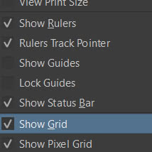In the "View" menu we activate the display of both the rulers ("Show Rulers") and the grid ("Show Grid").