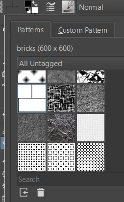 while if we want to permanently save a pattern, we will have to press the "Add to Predefined Patterns" button, then the file browser of your operating system will open, in the "Krita > patterns" directory inside the directory of your user profile, and the file can be saved with the ".pat" extension (that is, pattern/motif), which is a GIMP format, but also in png, jpg, tiff and bmp formats (the most suitable format also depends on whether the pattern has a transparent background or not). We have chosen the name and format "bricks.pat" and the pattern will appear with that name (and with the dimensions with which we had built it) in the list of patterns.