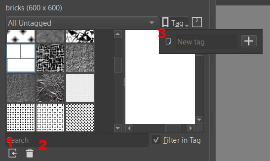 (1) we can import patterns from external files, (2) or remove the currently selected pattern, (3) or it is possible to create a new tag that identifies a specific set where to group some patterns (for example those that represent the texture of a fabric, or those that are used to create tiles etc.).