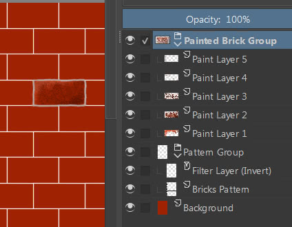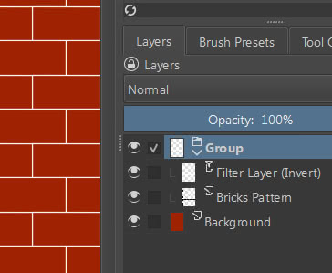 For example, we can add a brick-colored background and insert our pattern in a group (for example, painting a layer with the bucket) and a filter that inverts the color from black to white