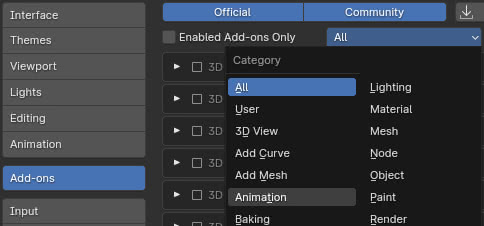 En la pestaña "Add-ons" seleccionamos la categoría "Animation"