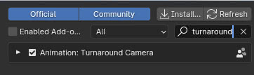 y en los resultados marcamos la opción "Animation: Turnaround Camera" para activar el complemento correspondiente