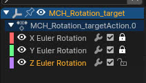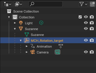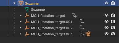 Una vez construido, miramos en el "Outliner" y descubrimos que se ha creado un objeto "empty" "MCH_Rotation_target", hijo del objeto objetivo según el proceso típico de parenting entre objetos, que a su vez se ha convertido en el padre de la camera, al girarla hace que la camera orbite alrededor del objeto.