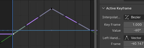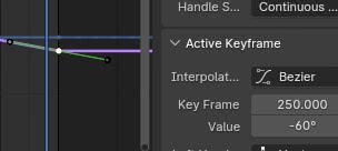 por lo tanto en el último frame, en nuestro caso el 250, volvemos a darle el valor -60 a la rotación