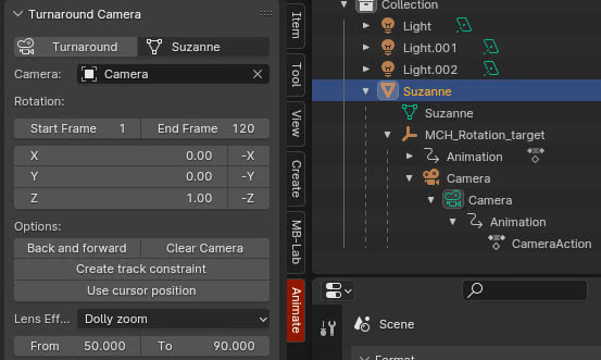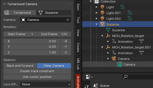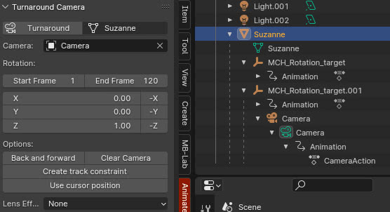 Create track constraint: habilitar esta opción creará una restricción de "Track To"; de hecho si lo habilitamos y creamos la animación haciendo clic en el botón "Turnaround", si seleccionamos la camera en el "Outliner" encontraremos que, en la pestaña "Object Constraint Properties", se ha creado una restricción "Track To" que tiene como "Target" el "MCH_Rotation_target" "empty".