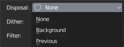 Indica che metodo di smaltimento utilizzare per i frames, cioè cosa fare di ciò che è contenuto nel frame attuale quando si passa al successivo. Per esempio, se dobbiamo salvare in formato gif l'animazione di un movimento di un cubo con sfondo trasparente, se scegliamo l'opzione "Previous" al termine della visualizzazione dell'immagine corrente riporta la situazione a come era prima che l'immagine fosse sovrapposta, quindi elimina di volta in volta il cubo e aggiunge quello nella posizione successiva, visualizzando frame per frame un solo cubo.