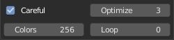 "Careful" permette di evitare alcuni bugs presenti in alcuni player, "Loop" indica il numero di volte che l'animazione può ripetersi (settando un valore pari a zero la farà ciclare infinite volte) , "Optimize" in cui si seleziona il tipo di ottimizzazione, salvando solo le modifiche all'interno delle animazioni oppure solo la parte di immagine non trasparente, e infine "Colors" che permette di scegliere 256 colori, oppure meno, per diminuire ancora di più le dimensioni del file.