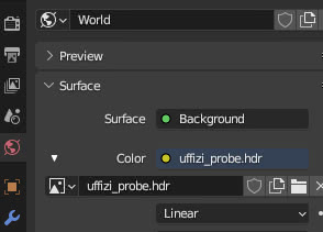 Na guia "World Properties" usamos a imagem HDR "uffizi_probe.hdr" para a iluminação ambiente (útil para "animar" os reflexos do metal) baixada do site https://www.pauldebevec.com/Probes/