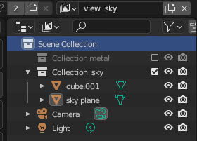 Na "Scene Collection" criamos duas coleções "Collection metal" e "Collection sky". "Collection metal" representa a cena apenas com o cubo, sem que o plano seja refletido, enquanto "Collection sky" representa a cena do cubo ("cube") que reflete o céu, portanto contém uma cópia do cubo e do plano ("sky plane"). A lâmpada e a camera são externos a estas duas coleções, pois são comuns às duas situações (até o cubo seria comum, mas para simplificar criámos "agrupamentos lógicos").