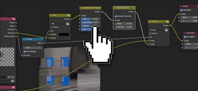 Neste caso, não usamos a imagem final da camada "view sky", que também inclui contribuições de outras fontes, mas apenas os reflexos indiretos, que são gerados pelos objetos que são refletidos no vidro (neste caso, o plano com a textura do céu), então usaremos a saída da porta "GlossInd", em vez da "Image" mais completa. Para misturar com o restante da edificação ainda podemos usar o nó "Mix" ("Add > Color > Mix") para misturar as duas camadas, mas é melhor escolher uma opção "Screen" que, mesmo usando algum nó para ajustar brilho e cores ("Add > Color > Hue Saturation Value" e "Add > Color > Bright/Contrast"), simula melhor os reflexos de uma janela.
